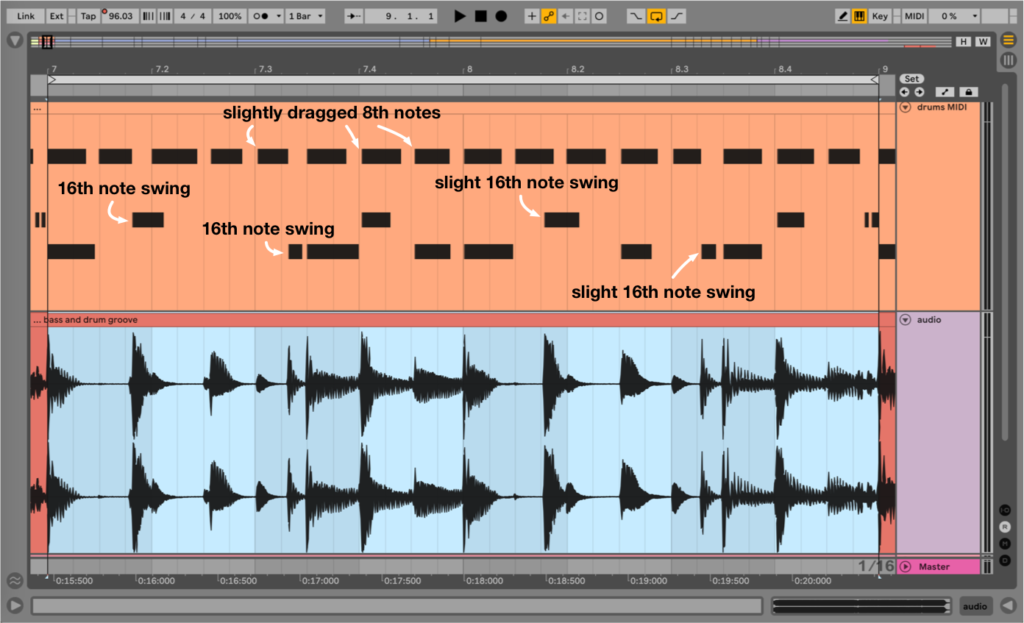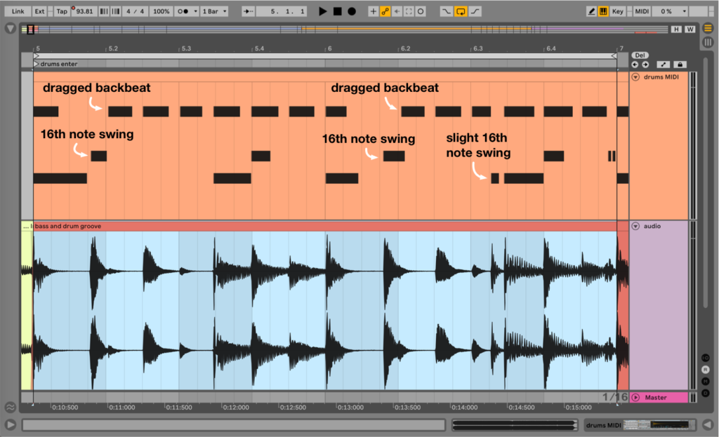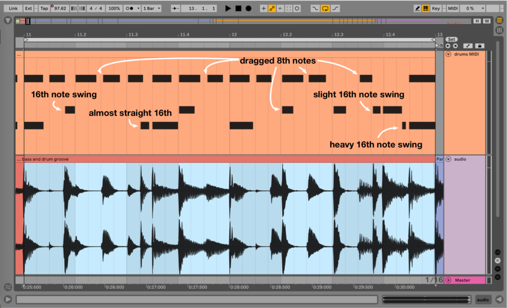 Both notation and the Groove Pizza are necessarily simplified versions of the actual performed rhythms. To get the timing more exactly, I put the track into Ableton and warped it out. I aligned the downbeat kick on every odd-numbered bar to the grid, because those feel like strong hypermetrical accents. I then used Ableton's audio-to-MIDI function to get the drum timing. I had to correct the MIDI a bit, because sometimes the software hears hi-hats that aren't there. However, its timing accuracy is excellent. (At least, it's excellent for onsets; it's harder to determine the length of the drum hits exactly, because they decay gradually.)