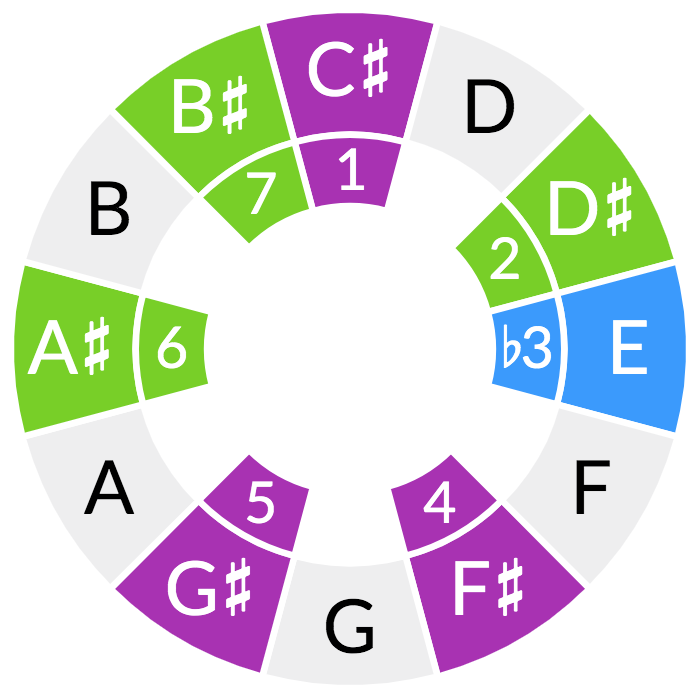 The next three notes in the riff are D-sharp, F-sharp, and A-sharp, which together make a D# minor chord. However, they have another relationship too. If you take these notes and put B underneath them, you get an Bmaj7 chord. Even without the B present, your ear still detects the major seventh chord structure. This minor-major ambiguity combines with the syncopated rhythm to give the riff its sophisticated, jazzy intrigue.