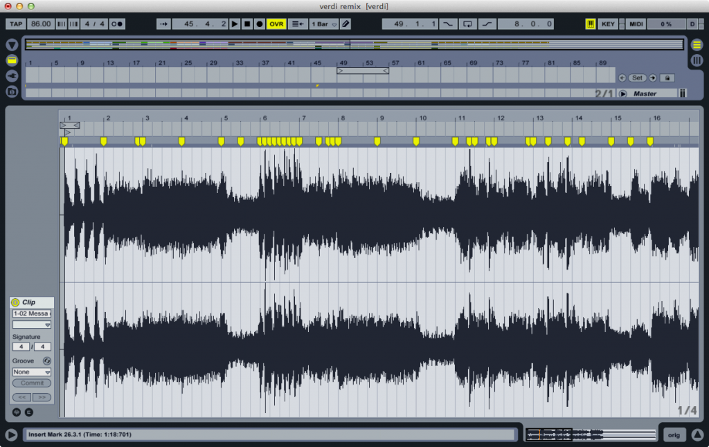 The first task is to drop the piece into a track in Arrange view. Next, I warp it out, which is Ableton-speak for finding the bars and beats in the music and making sure they line up with the software's time grid. Warping is easy with metronomic pop music; you just identify the first downbeat, and Live usually handles the rest automatically. Things get more difficult with classical music, which tends to take a looser approach to time than the dance music that Live was designed for. But it turns out that Verdi's "Dies Irae" doesn't vary too much from metronomic time, so warping it requires minimal effort. The yellow markers in the image below are "handles" you can use to drag parts of the audio to and fro.