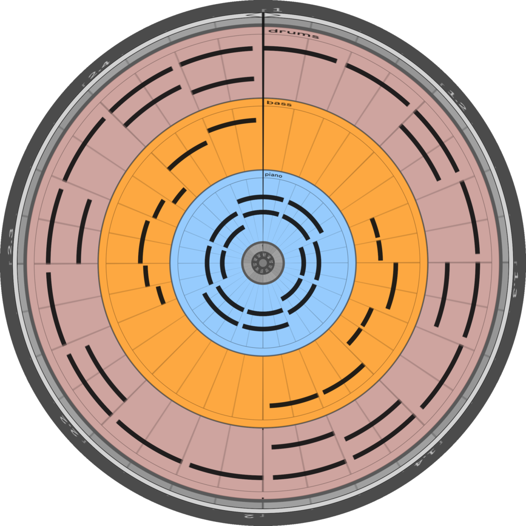 Usually a groove begins with a strong accent on the downbeat from the kick drum, bass, and other foundational elements. In "Thelonius," however, the kick, bass and piano all hit an eighth note before the downbeat. From there, the drums play a standard backbeat pattern, but the kick never hits on the downbeat. It does hit on beat three, so your ear is constantly wondering if that isn't actually the downbeat. See what I mean on the Groove Pizza: it takes a lot of focus to hear slice one as the downbeat rather than slice nine.